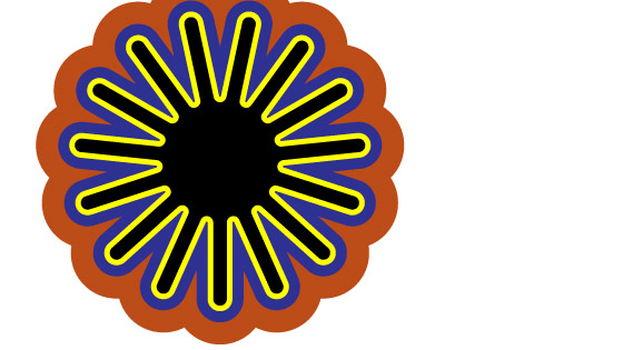 Object menu and ungroup, delete outer circle, select all the radial strokes, set the width to 12px, object menu and expand, pathfinder panel, unite, object menu and path and offset set to 10, change color, repeat offset, change color for that offset and so on