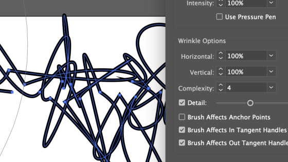 There are a lot of options to take in with the wrinkle tool such as width + height + angle + intensity + pressure + horizontal wrinkle + vertical wrinkle + complexity + detail + brush affects anchor + brush affects + anchor in tangent + brush affects anchor out tangent